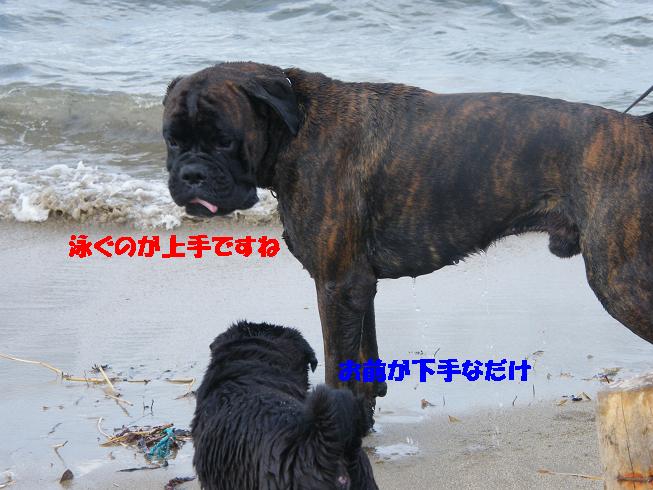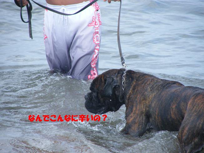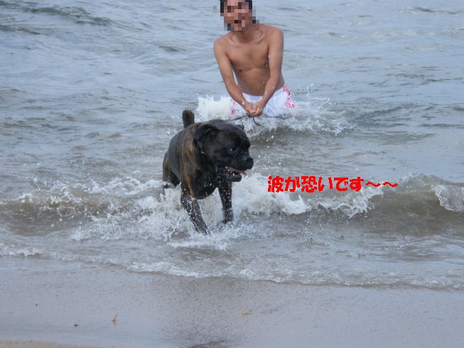 飼い主が海へ引っ張り込むのだが直ぐに岸へ戻っていく。
