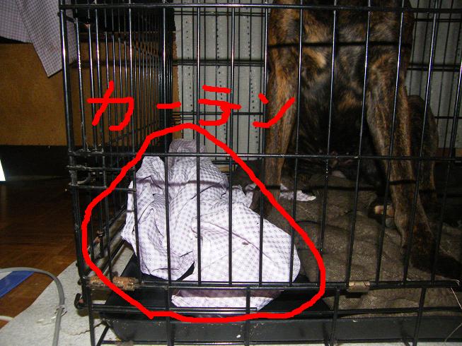 窓際のゲージに入れられているグッシーがカーテンをゲージに引きこんで・・・・