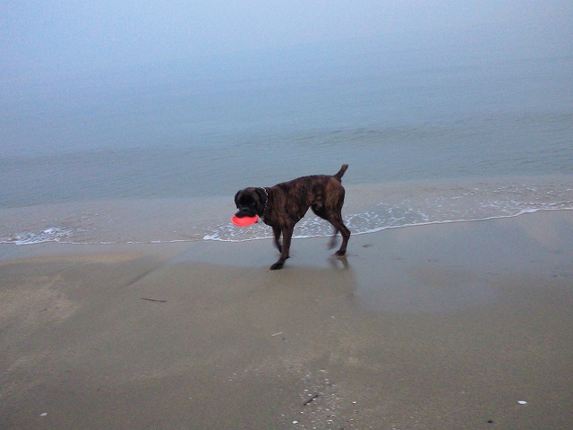 フリスビーを加えたグッシーは寒いのになぜか波打ち際を歩く。