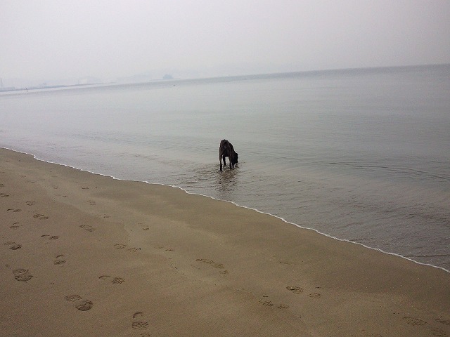 ゆっくりと波打ち際を息子とグッシーと1時間ほど散歩。
