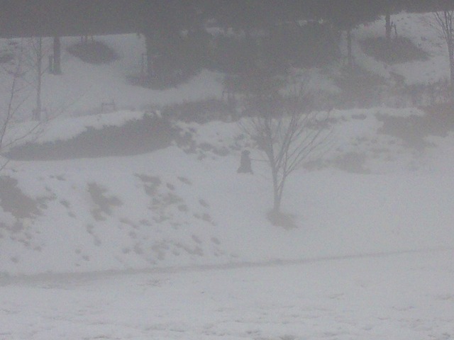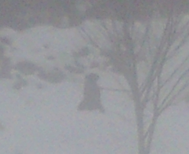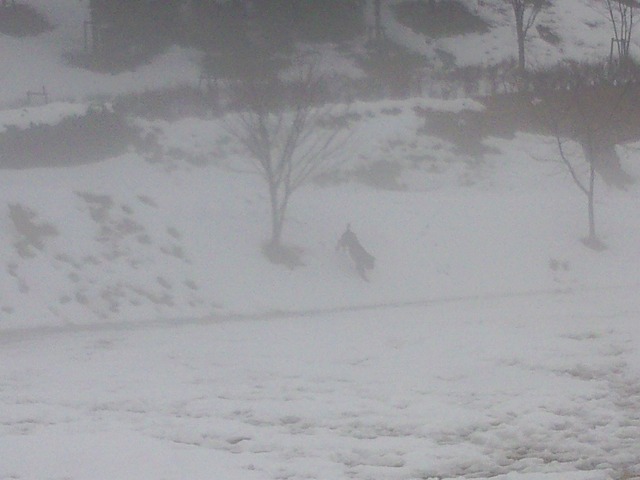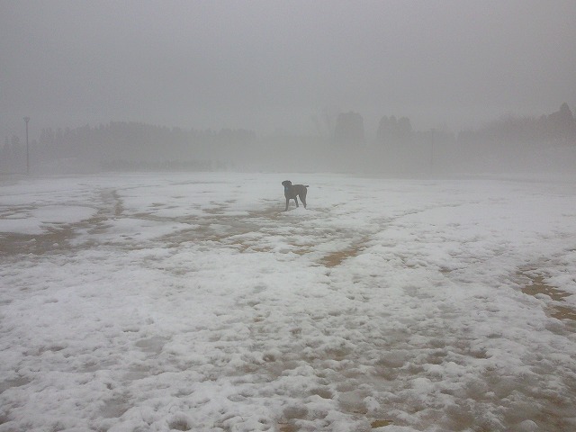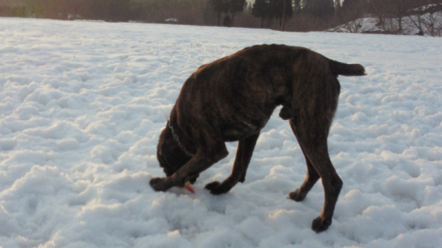 夕方にお山へ出向き、溶け始めた歩き難い雪の上でフリスビーで遊ぶクグッシーですがいつもと違った状況が御座いました。