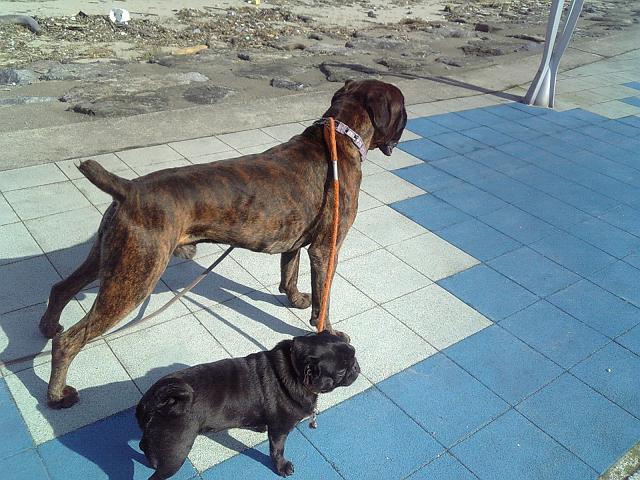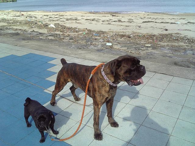 2匹の後ろの汚い浜は先日の強い風で起こった波によるもので道路の所まで波が来ていました。